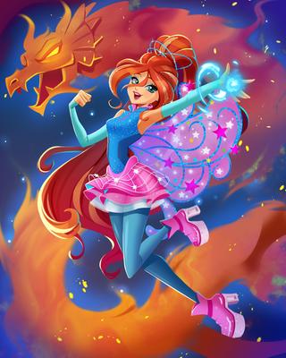 8" x 10" art print of Bloom from Season 8 of The Winx Club, in her Cosmix form, flying high in space with the Dragon Flame by her side!
